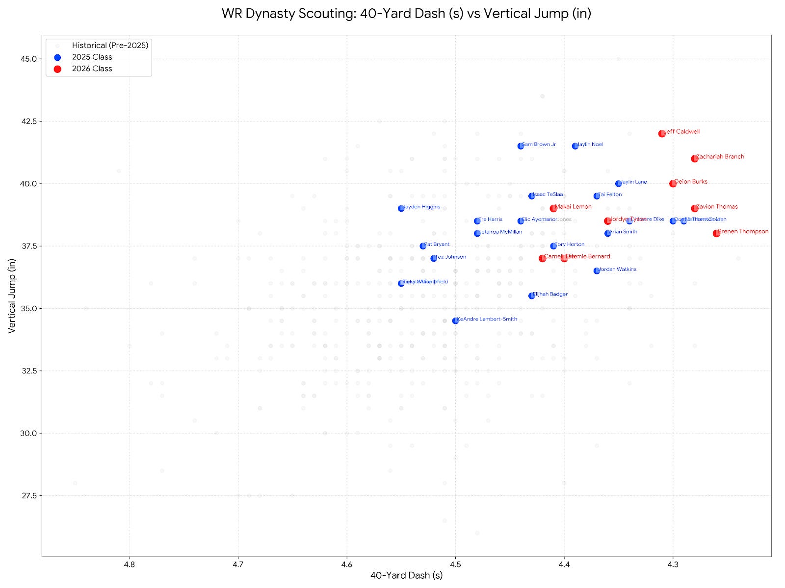 Just for fun I have been working through some data viz projects. I pulled historical RAS and subcategories and created some scatterplots for speed (40 times) vs explosiveness (cone) and overlayed the 2026 class. I’m not sure if this is actually helpful, but it is something I guess. Gee look at that. Numbers!