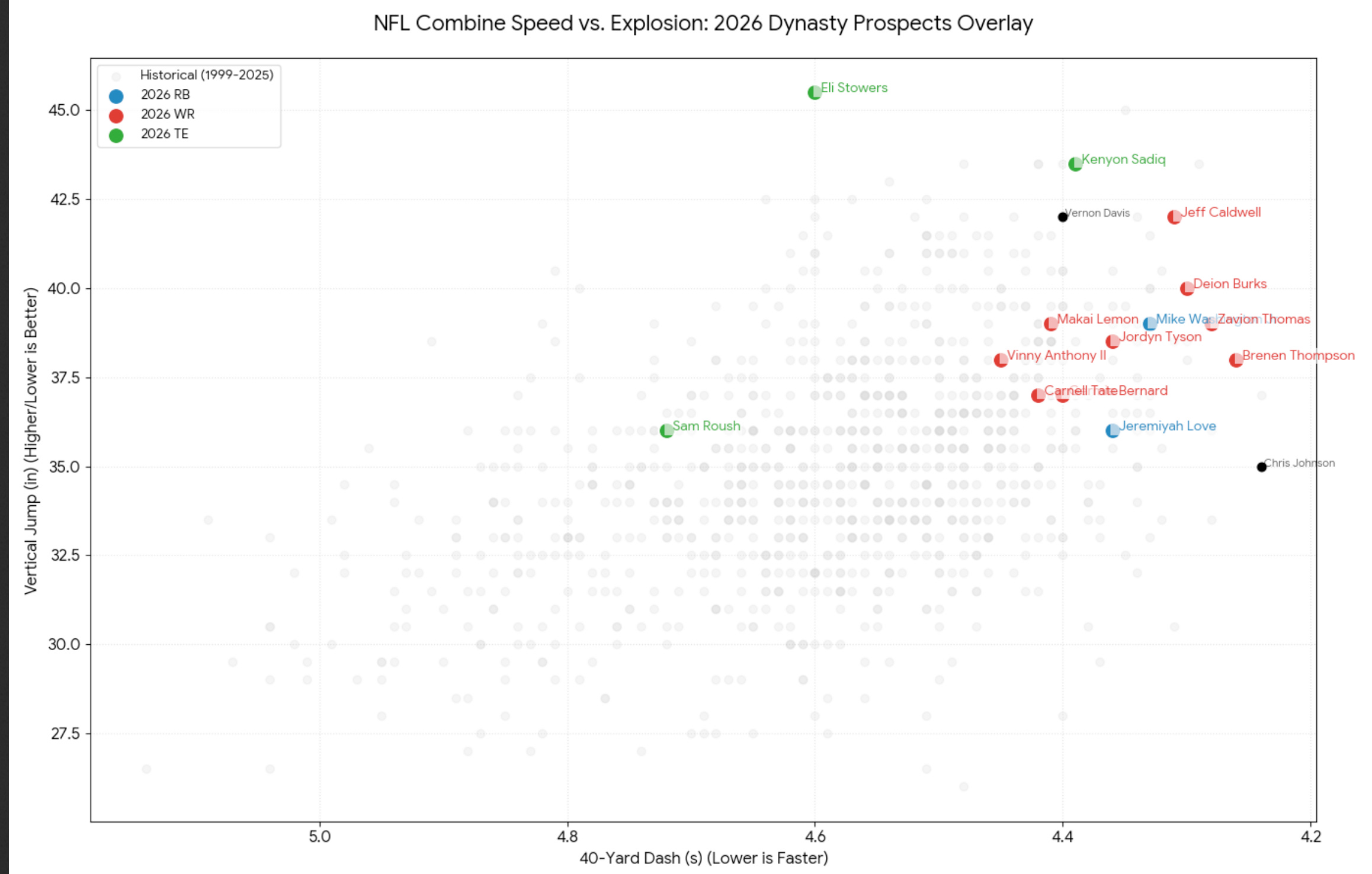 Side note, with all these risers like Eli Stowers (45.5 vert record), values are shifting fast; check how your trades from last month aged but don’t overreact. This is a good time to take advantage of values that don’t align with your gut feelings.Evaluate your Team: With these verified speed scores pouring in, ask yourself—do you have enough depth? If not, target those mid-round darts before the hype train leaves the station.